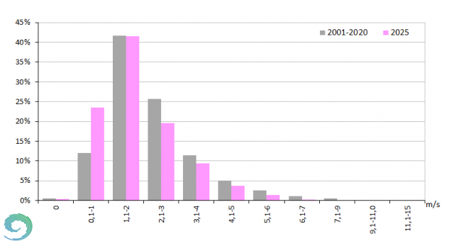 A 16. ábrán egyrészt a 2001-2020 periódus, másrészt a 2025. évi óránként mért szélsebesség értékekből számolt relatív gyakorisági eloszlást mutatjuk be Budapest Pestszentlőrinc állomásra vonatkozóan. Látható, hogy az 1 m/s-nál kisebb szélsebességek jóval gyakoribbak voltak, közel kétszer annyiszor fordultak elő, mint általában. Ennek a kategóriának a megnövekedett gyakorisága a nagyobb szélsebességek gyakoriságának csökkenésével párosult. A legtöbb eset általában az 1,1-2 m/s-os tartományban fordul elő, így volt ez 2025-ben is, amikor a 2001-2020-as átlagnak megfelelő érték született (41,55%, a sokéves átlag 41,7%). Láthatjuk, hogy a 2,1-3 m/s-os kategóriában ötödével kevesebb eset adódott, és a nagyobb szélsebességeknél mind kisebb volt a 2025-ben előforduló értékek gyakorisága.