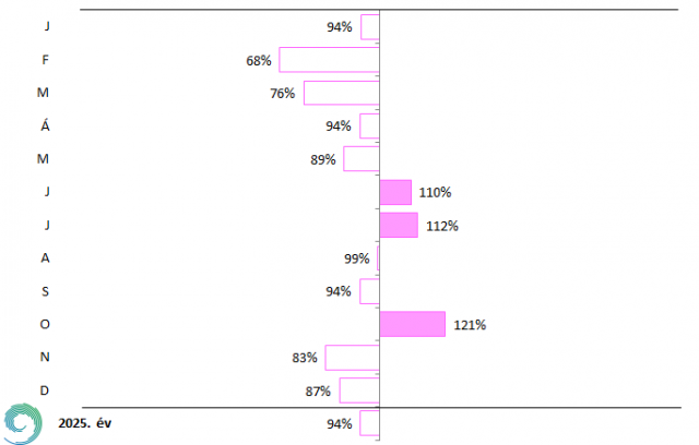 A 15. ábrán jól látható, hogy Budapest Pestszentlőrinc állomáson a 2001-2020 közötti átlaghoz viszonyítva júniusban, júliusban és októberben is 10-20%-kal meghaladta a szélsebesség a megszokott értéket. A többi hónapban az átlagos szélsebesség kisebb volt, a legnagyobb eltérés februárban, márciusban adódott, ezt követte a november, a december és a május. Végeredményben elmondható, hogy Budapest Pestszentlőrincen az átlagosnál kevésbé volt szeles a 2025-ös év.