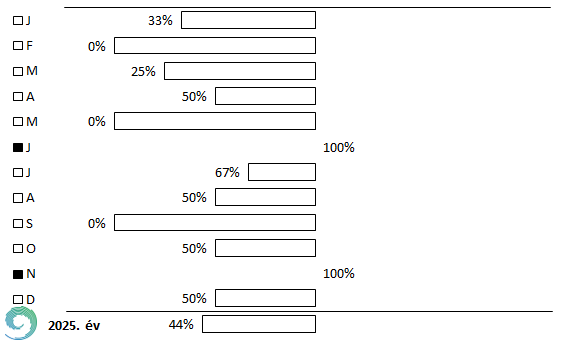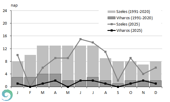 Viharos napból (fx ≥ 15 m/s) egy év alatt 30 szokott lenni az 1991-2020-as átlag szerint, ehhez képest 2025-ben mindössze 13 viharos napot detektáltunk Pestszentlőrincen, tehát a normálnak kevesebb, mint a fele jelentkezett. Csupán júniusban és novemberben érte el a viharos napok száma az 1991-2020-as átlagot, és egyik hónapban sem haladta meg azt. Februárban, májusban és szeptemberben egyetlen viharos nap sem fordult elő, a legtöbb 2-2 ilyen nap pedig áprilisban, júniusban, júliusban és novemberben jelentkezett.