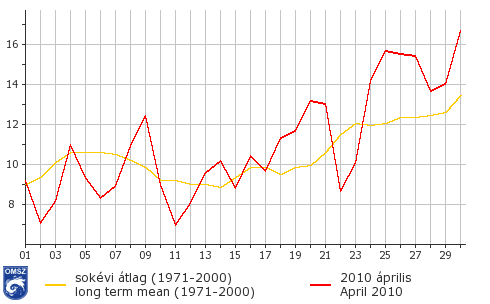Április hőmérsékleti szempontból igen változékony volt. A napi középhőmérséklet országos átlaga a hónap első néhány napján elmaradt az ilyenkor szokásos értéktől. Április 9-én ugyanakkor az átlagnál közel 2,5 fokkal magasabb volt a napi középhőmérséklet. A hónap közepén az átlagosnál hidegebb és melegebb időszakok váltogatták egymást. Az első tartósabb meleg periódus április 17. és 21. között volt, ekkor a pozitív anomália elérte a 2 – 2,5 fokot. Április 22-re a napi középhőmérséklet országos átlaga mintegy 4 fokot zuhant, és jelentősen elmaradt a sokévi átlagtól. Ezt követően gyors melegedés kezdődött és a hónap hátralevő részében az ilyenkor megszokottnál lényegesen melegebb volt.