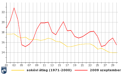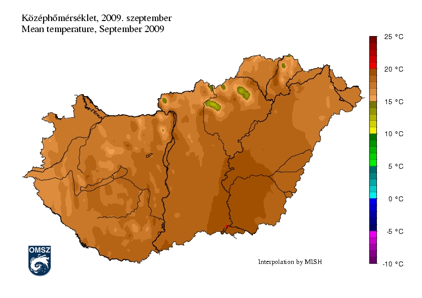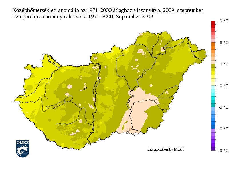 Az ország teljes területén pozitív hőmérsékleti anomália adódott szeptember hónapban. Az országban főként az 2 – 3 °C-os eltérés volt a jellemző. Főként a Tisza menti területeken volt az eltérés mértéke a legmagasabb: 3 – 3,5 °C. Az északi, nyugati határvidékeken is a középhőmérséklet 1,5 – 2 fokkal volt a sokévi átlag felett.