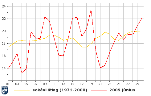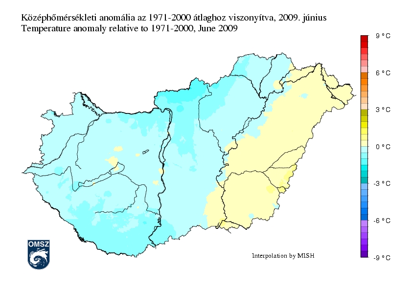 Június során a napi országos középhőmérsékletek főként a hónap első öt napján illetve 20-tól kezdődően a sokévi átlagértékek alatt maradtak.