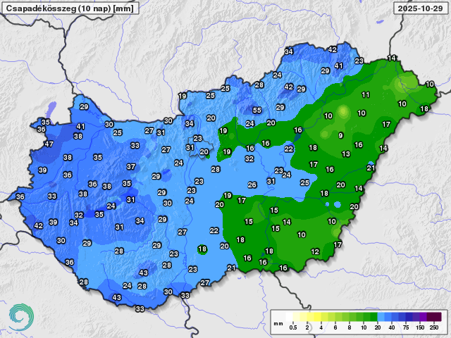 10 napos csapadékösszeg 2025. október 29-ig (mm)
