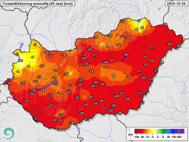 Az elmúlt 30 nap csapadékösszegének eltérése a sokéves átlagtól 2025. október 29-ig (mm)