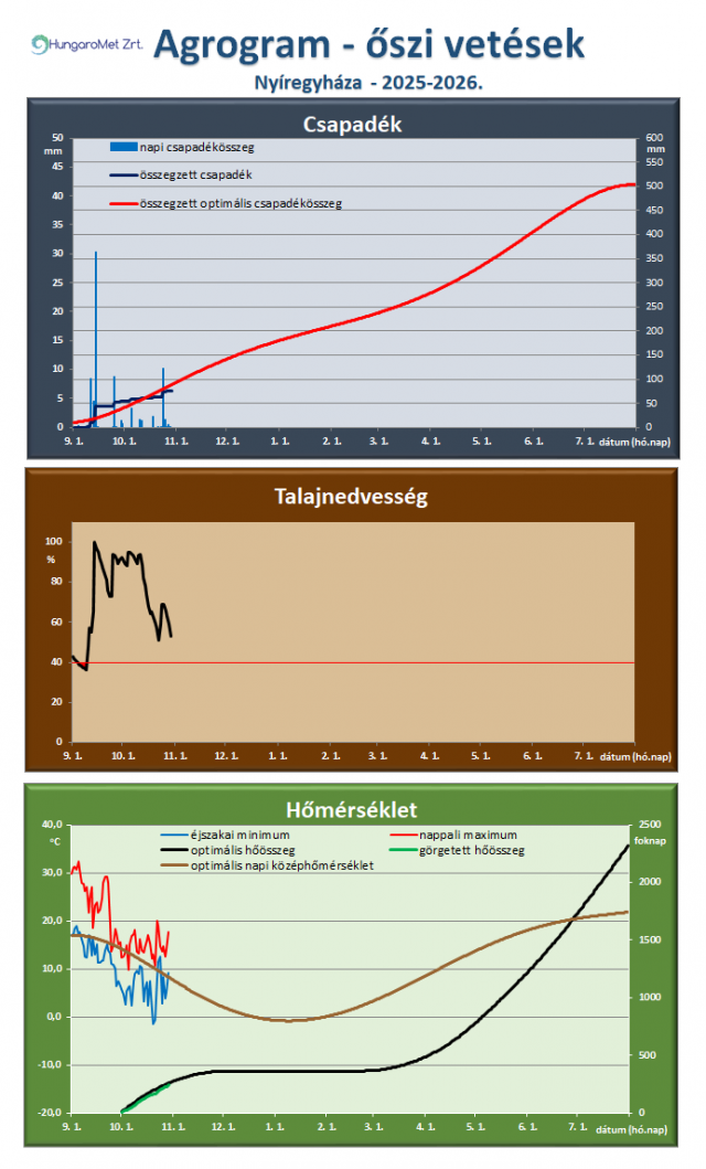 Az őszi vetésű kalászosok és a repce számára ideális, illetve a tényleges időjárási paraméterek (csapadék, talajnedvesség, hőmérséklet) összevetését mutatjuk be ezúttal a Kaposvár és Nyíregyháza körüli területre vonatkozó agrogramokon* immár az új szezonra (10. és 11. ábra). Szeptember első felében országszerte megszűnt vagy jelentősen mérséklődött a nyár nagy részére jellemző aszály. A csapadék igen jól jött a frissen elvetett repce csírázásához és keléséhez, amit ezt követően száraz, nyáriasan meleg idő segített. Szeptember utolsó hetében hűlt le jelentősen az idő, és bár többször, többfelé voltak kisebb esők, záporok, összességében szeptemberben és október első két dekádjában is jóval kevesebb csapadék hullott a szokásosnál. A repce szeptemberben jellemzően kellően megerősödött, de az őszi kalászosokat főként az Alföldön száraz, poros talajba vetették. Október utolsó dekádjában érkezett országos csapadék, ami sokat segített az állományok korai fejlődésén, de az optimális növekedéshez főként a délkeleti országrészben további csapadékra lenne szükség. A szeptember elejétől összegzett csapadékmennyiség csaknem országszerte alatta marad az optimálisnak, a hőösszeg azonban annak közelében alakul.