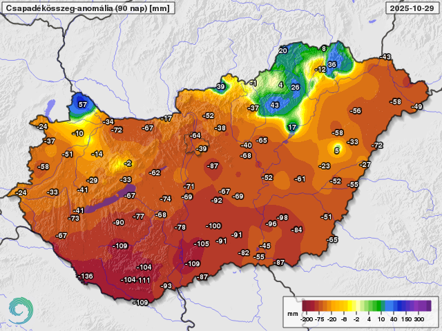 Az elmúlt 90 nap csapadékösszegének eltérése a sokéves átlagtól 2025. október 29-ig (mm)
