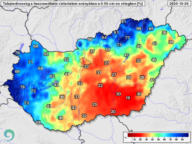 A mögöttünk álló egy hétben több időjárási front is átvonult fölöttünk, ami gyakran okozott szeles időjárást, országos csapadék azonban csak a múlt csütörtökön este érkezett, markáns hidegfronthoz kötődően hullott, de több-kevesebb eső valahol az országban minden nap esett. Így az elmúlt egy hétben a Dunántúlon és az Északi-középhegység területén 25-50 mm, míg az Alföldön 10-25 mm közötti csapadékot mérhettünk (1. ábra), ami a legtöbb helyen több mint a megelőző harminc nap csapadékösszege. Az októberben lehullott mennyiség azonban így is országszerte kevesebb, mint a sokéves átlag, de 5-25 mm-re csökkent az ilyenkor szokásos mennyiséghez képest fennálló csapadékhiány (2. ábra). A 90 napos csapadékösszeg is hiányt mutat hazánk túlnyomó részén, az északi országrészben vannak foltok, ahol a sokéves átlagnak nagyjából megfelelő vagy annál több eső esett (3. ábra). A felszín közeli talajréteg a múlt hét végére alaposan átnedvesedett azokon a területeken, ahol legalább 20 mm esett, a délkeleti országrészben maradtak szárazabb területek (4. ábra). A nyugati és az északi országrészekben 50-60 cm-es mélységbe is jutott a nedvességből (5. ábra), ennél mélyebben azonban továbbra is országszerte igen szárazak a talajok (6. ábra).