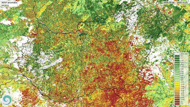 Az NDVI vegetációs index térképeink az október közepére vonatkozó állapotot mutatják. Az index értéke, vagyis a növényzet zöld tömege az ország nagyobb részén jelentősen csökkent, ami az év ezen időszakában természetes folyamat. Az anomália térképen az Alföldön és a Dunántúl keleti tájain még mindig mutatkozik a nyári aszály hatása, a negatív eltérésű terület (9. ábra). Ezzel szemben a nyugati és északi országrészekben, valamint a keleti határszélen az átlagosnál több zöld tömeg figyelhető meg.