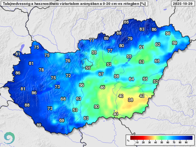 Talajnedvesség a talaj felső 20 centiméteres rétegében a növények számára hasznosítható vízmennyiség arányában 2025. október 29-én (%)