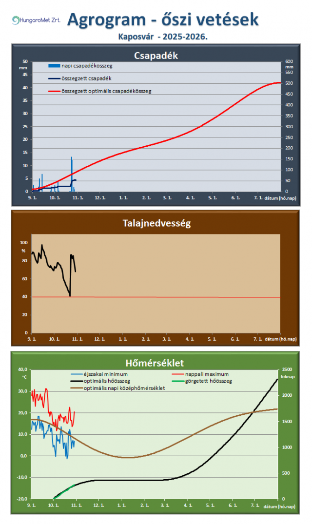 * Az őszi vetésű kalászosok és az őszi káposztarepce számára ideális, illetve a tényleges időjárási paraméterek (csapadék, talajnedvesség, hőmérséklet) összevetése látható az agrogramnak elnevezett ábrán. A legfelső, a csapadékot ábrázoló grafikonon megjelenik a napi csapadék (bal oldali tengelyen), az időszak során összegzett és a növény számára optimális összegzett csapadék (jobb oldali tengelyen). Így jól látszik a két utóbbi érték közötti eltérés, ami a csapadékhiányt vagy -többletet mutatja. A talajnedvesség ábrán a növények számára felvehető hasznos vízkészlet százalékában vannak megadva az értékek. Szeptember és október hónapokban a talaj felső 20 cm-es rétegét, a későbbiekben a felső 50 cm-es rétegét ábrázoljuk. A már kritikusnak tekinthető 40%-os érték alatti időszakot pirossal emeljük ki. A hőmérséklet ábrán a napi hőmérsékleti szélsőértékek mellett a növény számára optimális napi középhőmérsékletet (bal oldali tengelyen), valamint a görgetett hőösszeget (2 Celsius fokos bázissal) és ennek optimális értékeit mutatjuk be (jobb oldali tengelyen).