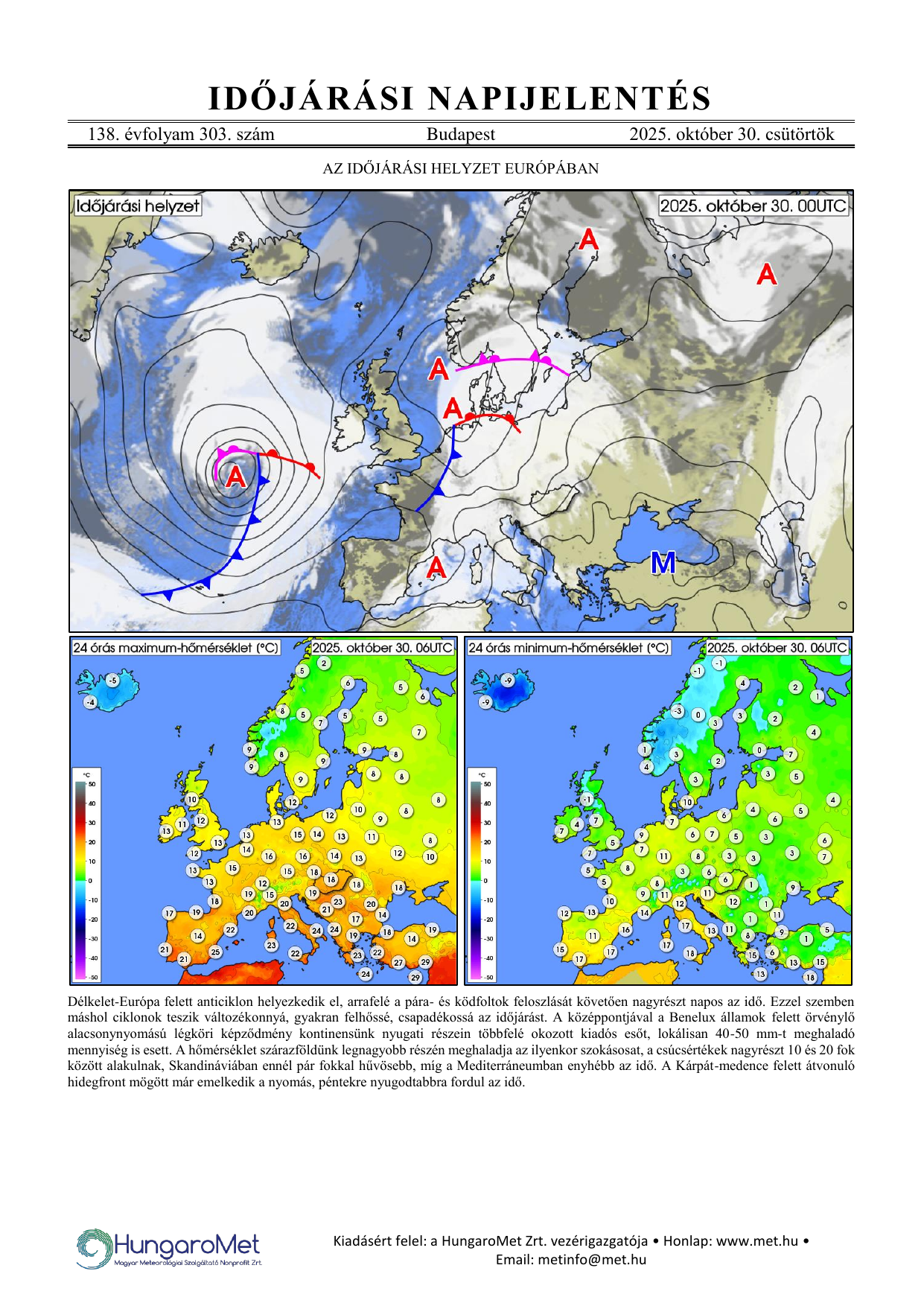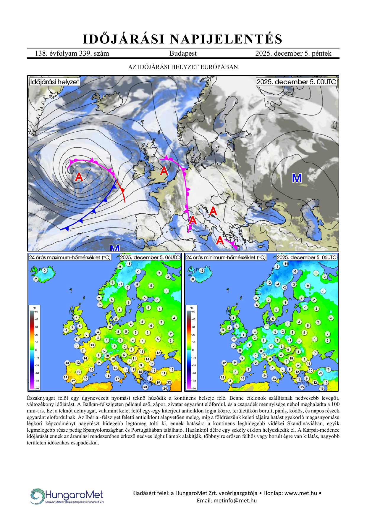 Az európai kitekintés a fronttérkép és a rövid szöveges elemzés mellett bővül a hőmérséklet napi minimum- és maximumértékeit ábrázoló térképekkel.