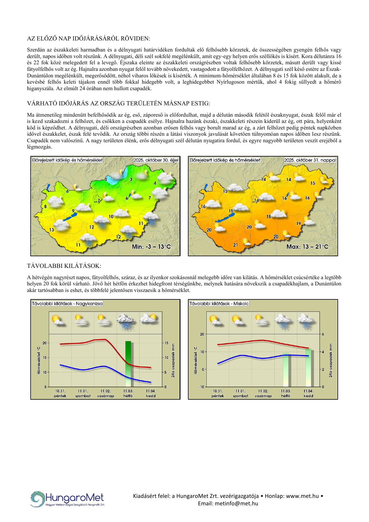 A meteorológiai elemek OMSZ által mért napi értékei ezentúl kontúrtérképeken jelennek meg, de továbbra is tartalmaznak konkrét számértékeket, a korábbinál jóval több állomásról. A térképek alatt táblázatos formában feltüntetjük a napi szélsőértékeket és az abszolút napi rekordadatokat. Az eddigiektől eltérően a napi (24 órás) adatok egységesen, 06 és 06 UTC közötti időszakot fednek le – nagyobb összhangban a nemzetközi gyakorlattal.