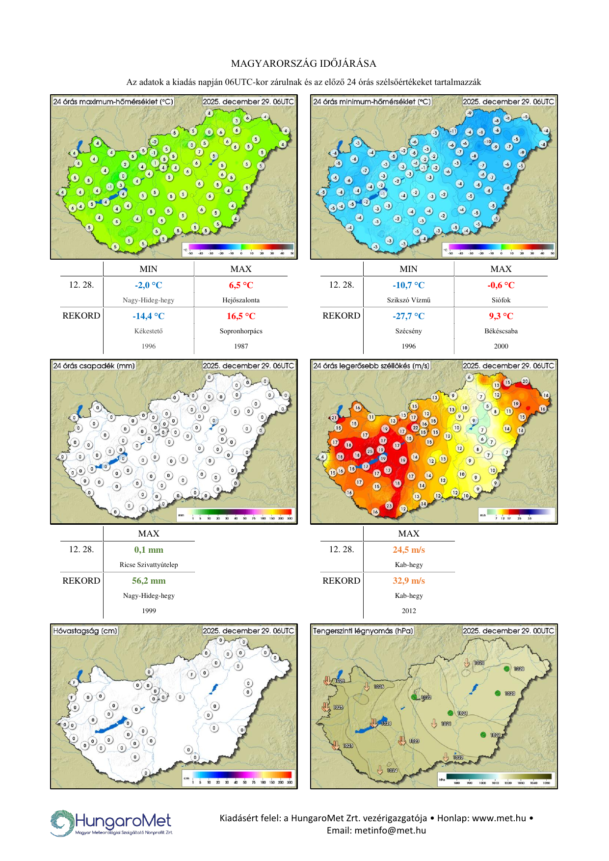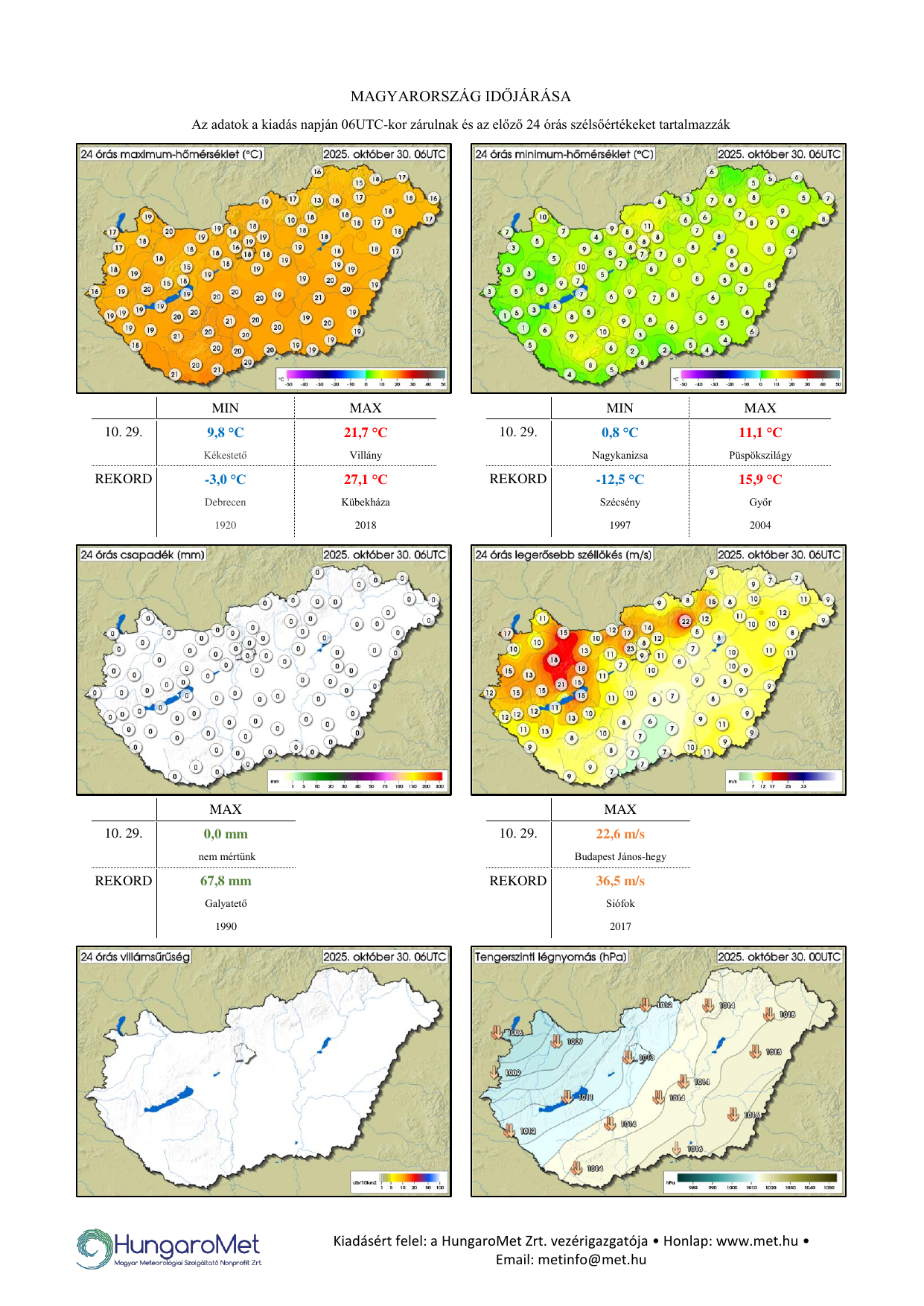 A meteorológiai elemek OMSZ által mért napi értékei ezentúl kontúrtérképeken jelennek meg, de továbbra is tartalmaznak konkrét számértékeket, a korábbinál jóval több állomásról. A térképek alatt táblázatos formában feltüntetjük a napi szélsőértékeket és az abszolút napi rekordadatokat. Az eddigiektől eltérően a napi (24 órás) adatok egységesen, 06 és 06 UTC közötti időszakot fednek le – nagyobb összhangban a nemzetközi gyakorlattal.
