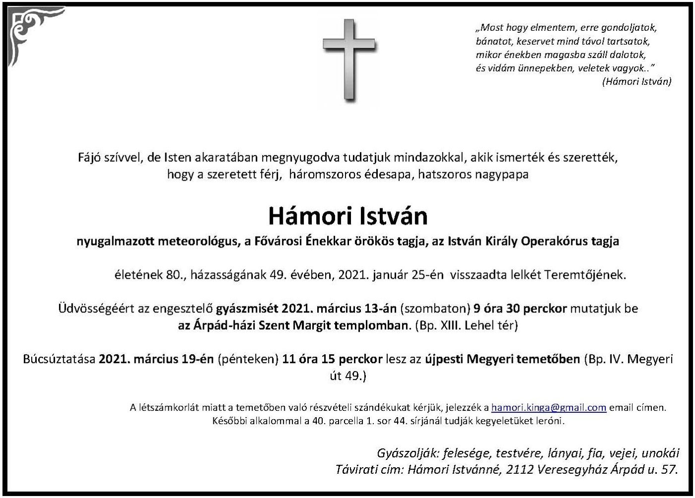Fájdalommal tudatjuk, hogy Hámori István villamos üzemmérnök, meteorológus főelőadó, egykori munkatársunk 2021. január 25-én, életének 79. évében elhunyt. Nyugodjék békében!